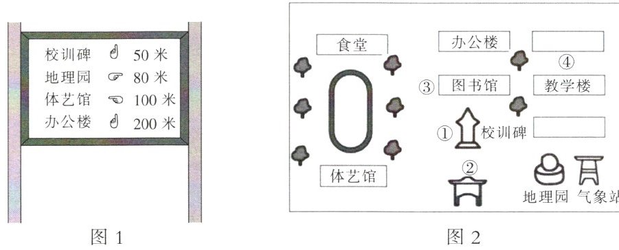 下面图 $1$ 为某校地理小组设计的校园景观指示牌,图 $2$ 为校园平面图(局部)。读图,完成 $3~4$ 题。