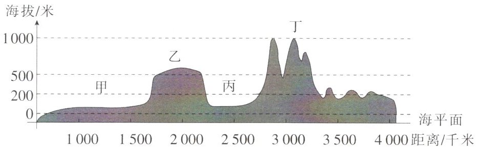 地理学习的重要方法之一是识图绘图能力,此图是小明根据地理课上习得的知识绘制的某地区地形剖面图。图中的甲、乙、丙、丁分别对应的地形类型是( )