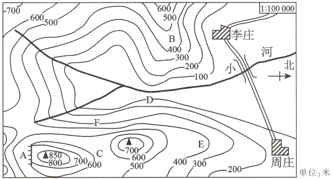 (5)该地计划修建一座水库,坝址应选在______(填字母)处附近最合适。周庄和李庄所在的地形类型是______,水库修成后______(填“会”或“不会”)淹没村庄。