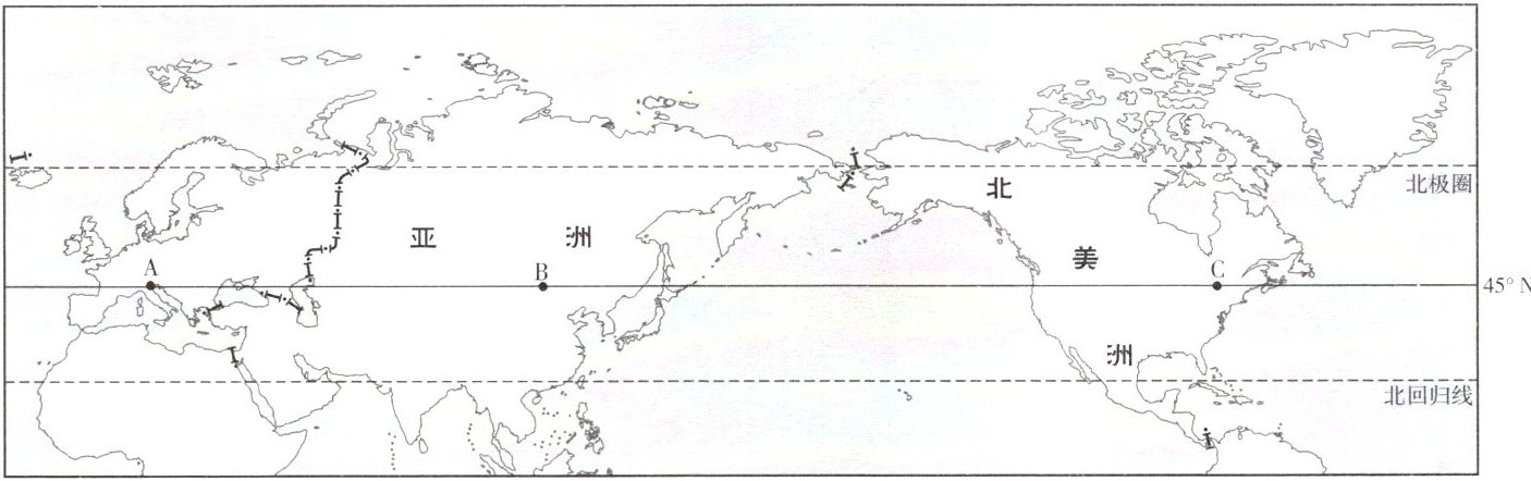 神奇的北纬 $ 45° $ 被称为“黄金草原带”,密布着全球众多优质牧场。读图,完成 5~6 题。