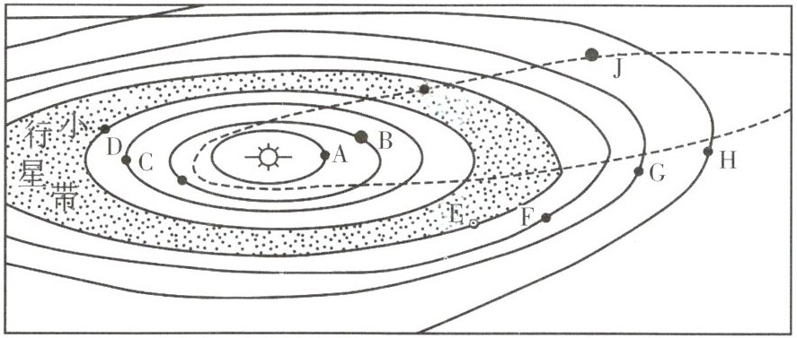 2. 小行星带是处在行星D______轨道与E______轨道之间;G______与H______两行星因距太阳较远,属远日行星。(填名称)