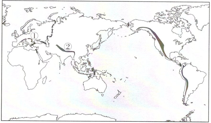 8. 横贯亚欧大陆中南部的①②两山脉分别是( )