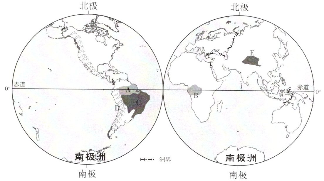 (2)赤道穿过的地形区:A____平原,B____盆地。