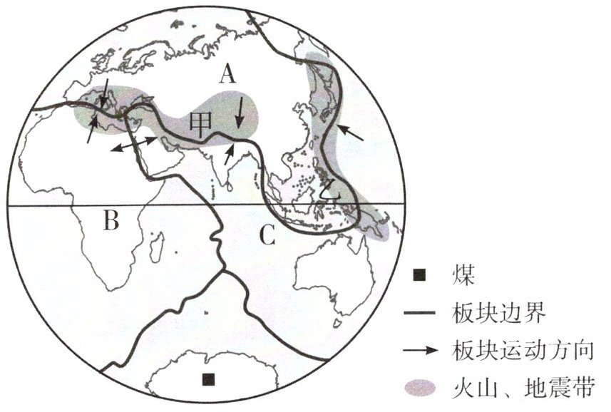 (2)读图可知,火山、地震带主要分布在板块的____(填“内部”或“交界地带”)。图中甲是____火山、地震带,乙是____火山、地震带的一部分,我国地处以上两大火山、地震带之间,地震活动较多。