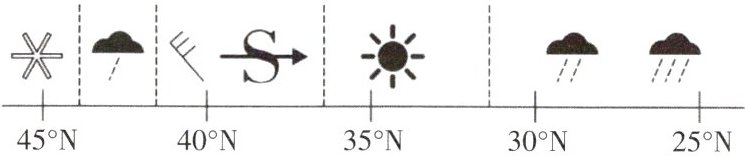 3. 下图为春季某日我国东部一条经线附近地区的天气状况示意图。图中 $40^{\circ}N$ 附近的天气状况是( )