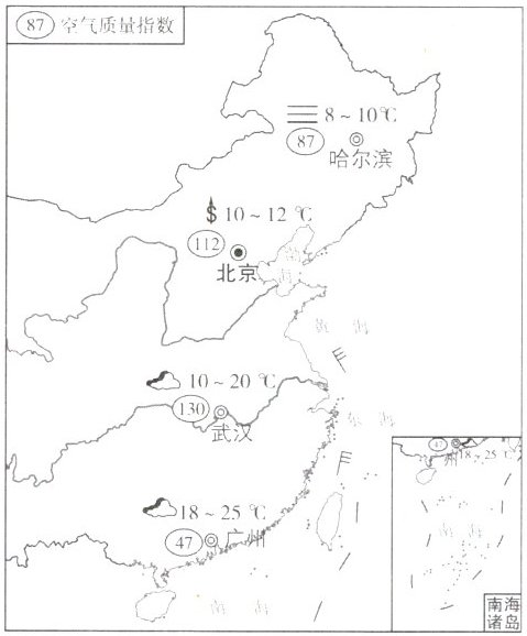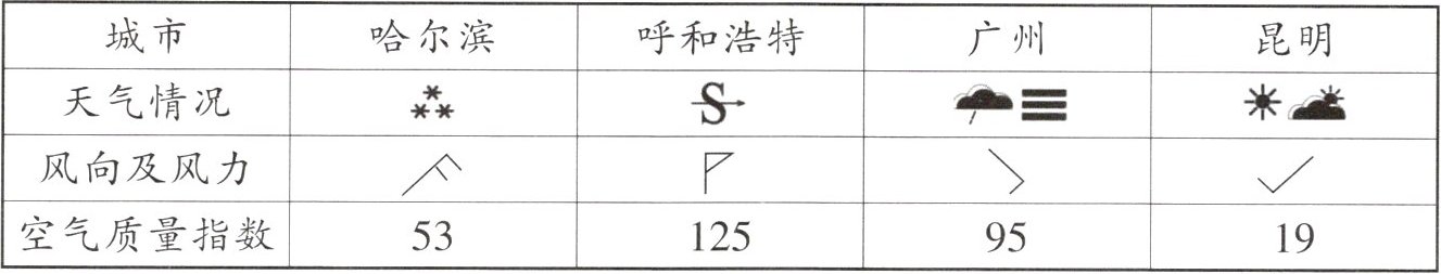 【解析】空气质量的高低,可以用空气质量指数来表示。指数大,空气质量差;指数小,空气质量好。由表可知,昆明空气质量指数最小,空气质量最好,A 正确;广州风力小,呼和浩特为沙尘暴天气,哈尔滨吹东北风,故 B、C、D 错误。