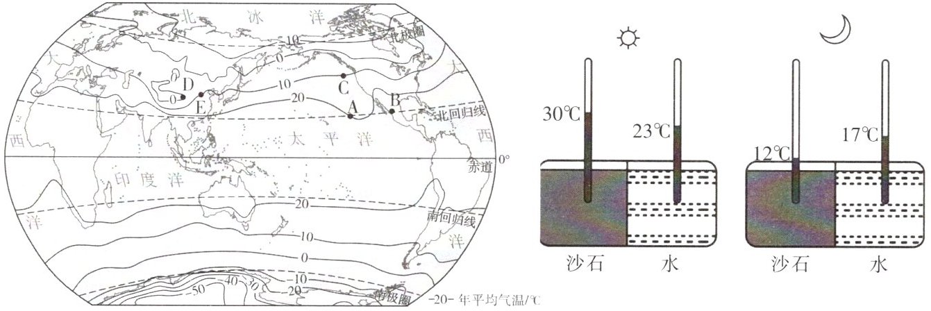 (3)某学习小组做了“影响气温的因素”分组实验,并记录了数据。通过实验得出的结论是:同纬度地区陆地气温日较差______(填“大于”或“小于”)海洋。据此,请你推测:同纬度地区陆地气温年较差______(填“大于”或“小于”)海洋。结合图中信息判断:A 地气温______(填“高于”或“低于”)B 地,此实验验证的影响气温的因素是______。