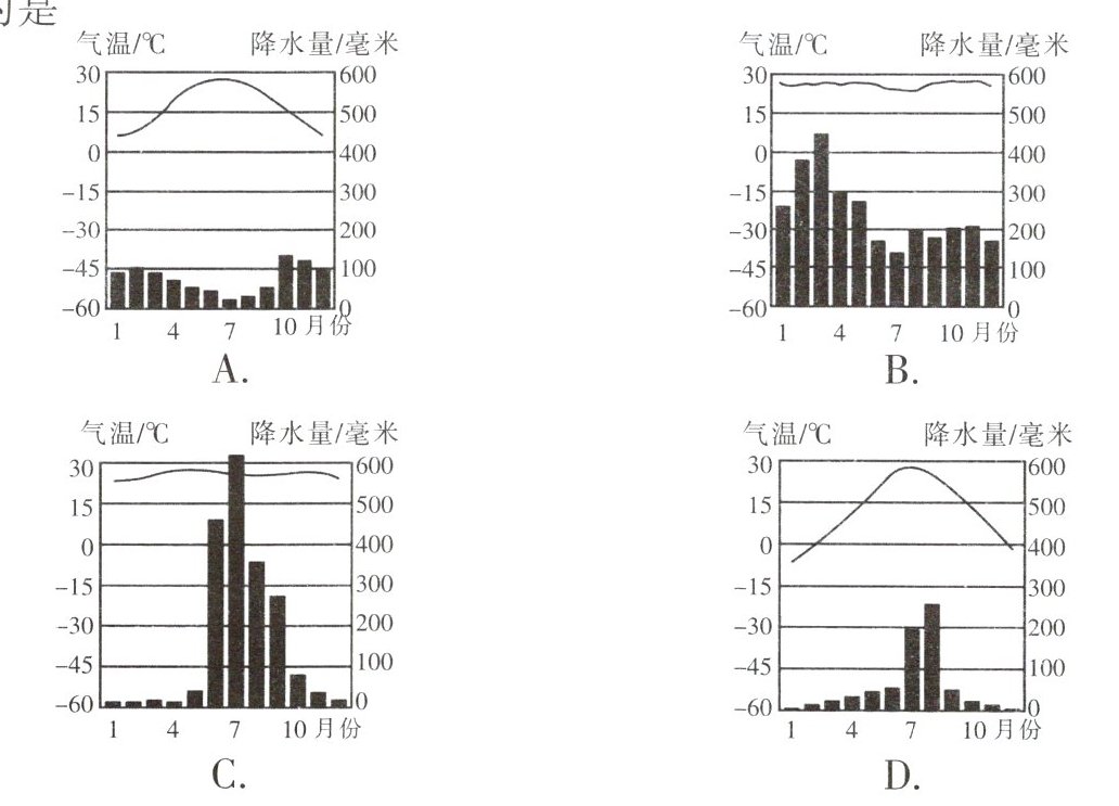 5. 山东菏泽处于温带,冬季寒冷干燥,夏季高温多雨。下列4幅图中符合这一气候特征的是( )