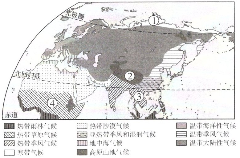 (3)④地所在大洲气候类型分布特征是______。该大洲北部有北回归线横穿,终年高温干旱,______气候分布较广,形成世界上最大的沙漠——______沙漠。