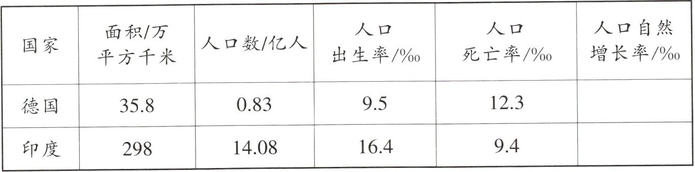 (1)计算德国、印度的人口自然增长率,分别填在表格最后一栏中。
