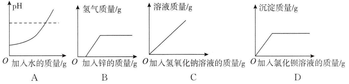 【解析】本题的难点是图像分析。可以通过分析图像的起点、拐点、趋势做出判断。向硫酸中加入水,酸性减弱,pH 不会等于 7 或超过 7,选项 A 不正确;锌和稀硫酸接触后,会立即产生氢气,图像的起点是原点,选项 B 不正确;一开始有硫酸溶液,溶液的起点质量不是 0,选项 C 不正确;向硫酸中加入氯化钡后立即产生沉淀,硫酸完全反应后,沉淀质量不再增加,选项 D 正确。