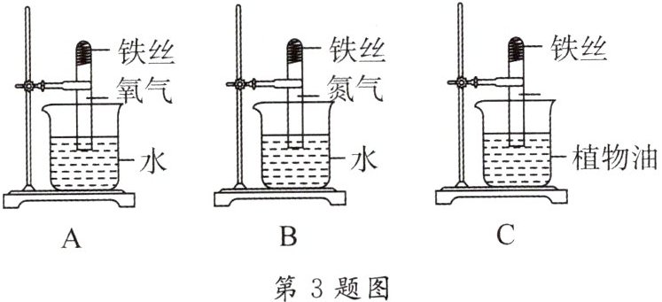 3. 如图装置可探究铁制品锈蚀的条件。一周后,${B}$、${C}$中无明显现象,${A}$中可观察到的现象是