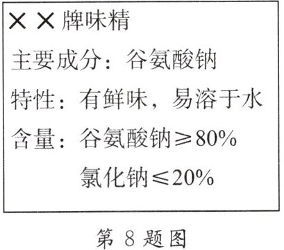 8. 味精是烹制菜肴时常用的调味品,某同学发现某品牌味精包装上的部分文字说明如图所示。他想测定此味精中氯化钠的含量。