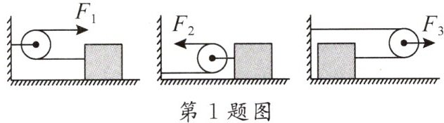 1. 如图所示的三个滑轮分别拉同一物体沿同一水平地面做匀速直线运动,所用的拉力分别为$F_1$,$F_2$,$F_3$,那么,下列关系式中正确的是(