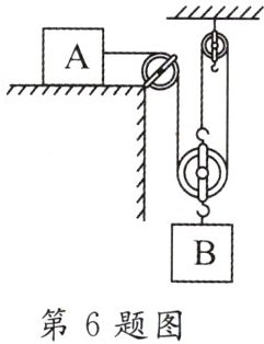 6. 如图所示,物体$A$、$B分别重20N$、$30N$,滑轮重和滑轮与绳子之间的摩擦忽略不计,此时物体$A$在水平面上向右做匀速直线运动。若用力$F向左拉物体A$,使物体$A$向左做匀速直线运动,则$F$的大小是
