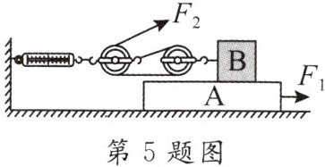 5. 如图所示,$F_1= 4N$,$F_2= 3N$,此时物体$A$相对于地面静止,物体$B以一定速度在物体A$表面向左做匀速直线运动(不计弹簧测力计、滑轮和绳子的自重及滑轮和绳子之间的摩擦)。则$A$与地面之间的摩擦力、$A与B$之间的摩擦力、弹簧测力计的示数大小分别为(