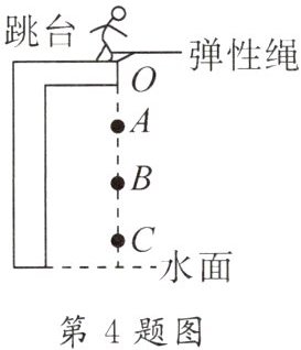 4. 如图所示为蹦极运动的简化示意图,弹性绳一端系在运动员双脚上,另一端固定在跳台$O$点。运动员由静止开始自由下落,$A$点处弹性绳正好处于原长;$B$点处运动员受到的重力与弹性绳对运动员的拉力大小相等;$C$点处是蹦极运动员到达的最低点。(整个过程中忽略空气阻力,弹性绳的自重不计)