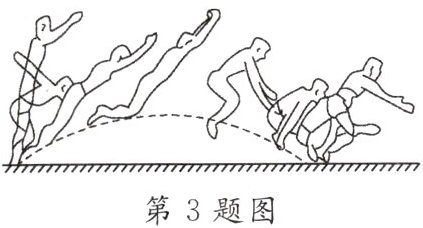 3. 立定跳远是中学生喜爱的体育项目之一,其动作分解如图所示。下列对某中学生在立定跳远过程中的相关分析正确的是(