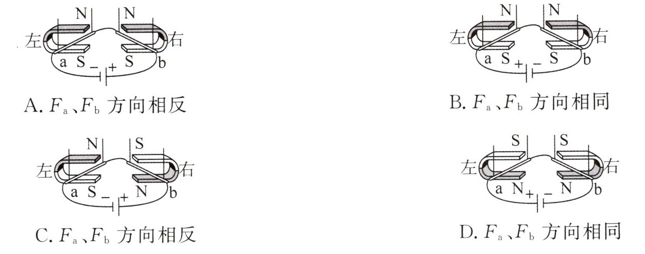 2. 如图所示,通电导体a、b固定不动。左磁体对a的作用力为$F_{a}$,右磁体对b的作用力为$F_{b}$,下列说法中正确的是(