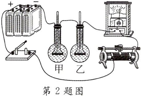 2. 如图所示为研究焦耳定律的实验装置,在两个相同的烧瓶中装满煤油。瓶中电阻丝的阻值关系为 $ R_{甲} > R_{乙} $。闭合开关一段时间,观察到甲瓶中煤油的温度高于乙瓶。这表明:在