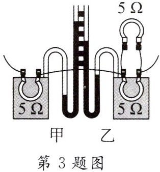 3. 如图是探究“电流通过导体时产生热量的多少跟什么因素有关”的实验装置。两个相同的透明容器中密封着等量且初温相同的空气,甲、乙两个U形管中液面初始状态是等高相平,通电一段时间后液面的高度如图所示。下列说法错误的是(