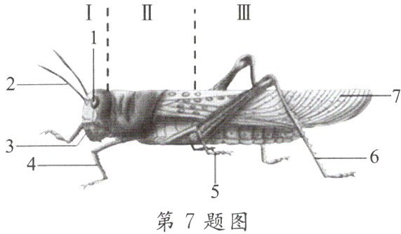 7. 蝗虫是一种世界性的农业害虫。其特点在于周期性的种群大暴发,并能长距离迁飞;分布十分广泛,这与其运动能力强是分不开的。如图是蝗虫形态结构示意图,请据图回答下列问题: