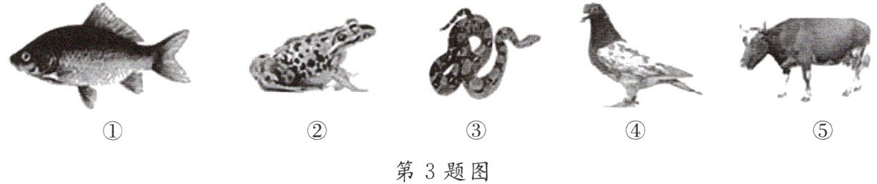 【解析】本题的难点是常见脊椎动物的身体结构特点,以及常见脊椎动物具体实例的识别。我们可以运用比较法与生物进化的思维方法,对常见脊椎动物的身体结构特点进行区分。①是鱼,属于鱼类;②是青蛙,属于两栖类;③是蛇,属于爬行类;④是家鸽,属于鸟类;⑤是牛,属于哺乳类。恒温动物是指体温不随环境温度的变化而变化的动物,恒温动物只包括鸟类和哺乳类,因此④家鸽体温稳定,A不正确。