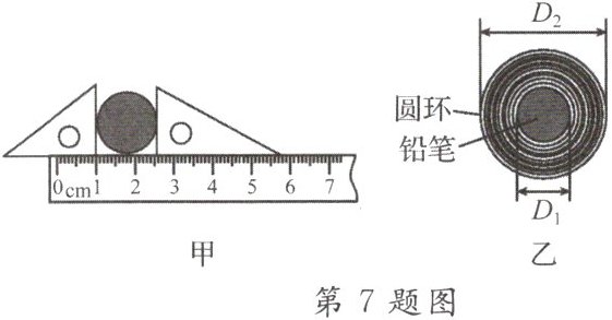 (2)一条纸带厚薄均匀,小科把纸带紧密地环绕在圆柱形铅笔上,直至恰好能套进一个圆环内,如图乙所示,纸带环绕了n圈,则纸带厚度是