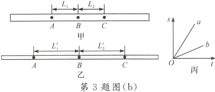 (2) 采用橡皮筋建立星系运动模型,步骤如下。以A点为参照物,做出B点和C点运动距离随时间变化的图像,如图丙,则能表示$v_C$(C点运动速度)的是______,由此能说明星系离我们的距离与它的退行速度之间有怎样的定量关系?______。