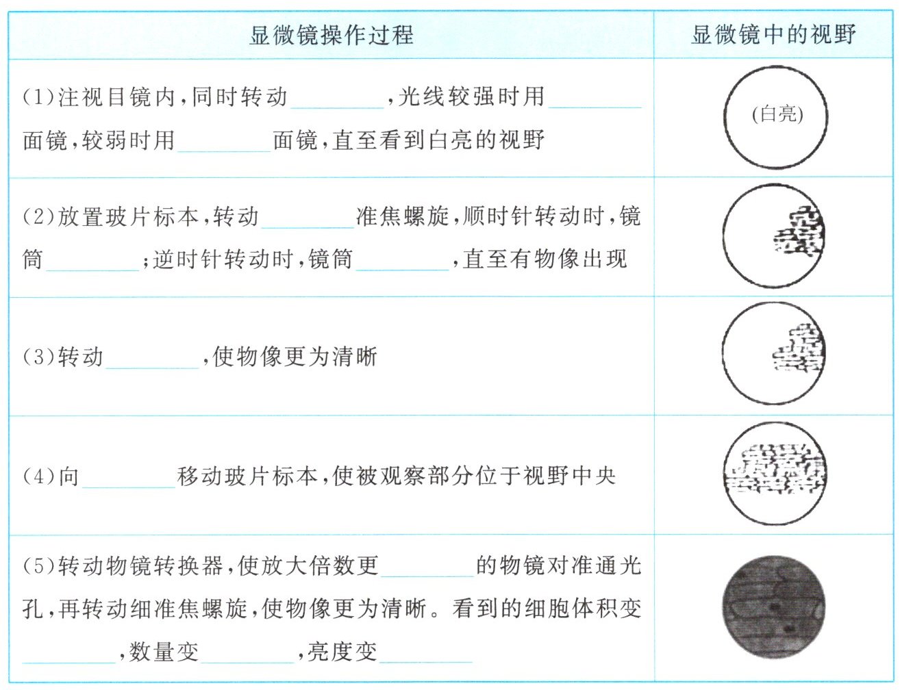 的物镜对准通光孔,再转动细准焦螺旋,使物像更为清晰。看到的细胞体积变大