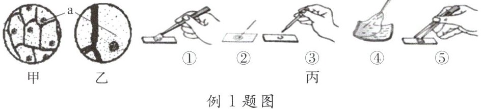 本题可从显微镜放大倍数与物像大小的关系、显微镜从低倍镜转换到高倍镜的操作、制作洋葱表皮临时装片的操作等方面进行分析得出。第(1)小题,根据物像大小分析,显微镜放大倍数小,观察到的物像小;甲图到乙图是低倍镜转换成高倍镜的过程,因为 a 在右上角,所以第一步应当将玻片向右上方移动使 a 移至视野中央,第二步把低倍物镜换成高倍物镜,由于此时视野会变得模糊,所以第三步调节细准焦螺旋至物像清晰。第(2)小题,对照制作洋葱鳞片叶表皮细胞临时装片的实验步骤:擦、滴、撕、展、盖、染,正确的操作顺序为③滴清水,④撕取材料,②展平,①盖盖玻片,⑤压片(赶出气泡)。