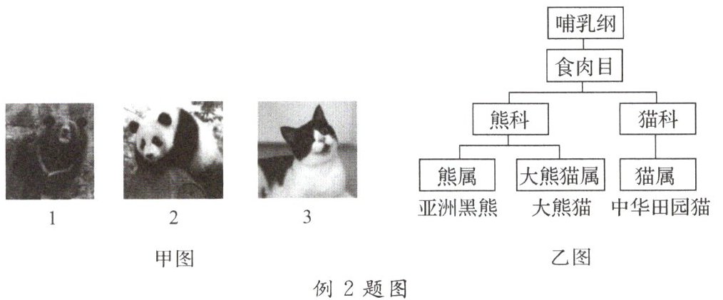 例 2. 甲图中 1 是我国二级保护动物亚洲黑熊,2 是我国“国宝”大熊猫,3 是黑白花纹的中华田园猫。它们的毛色均是黑白相间。下列说法正确的是(