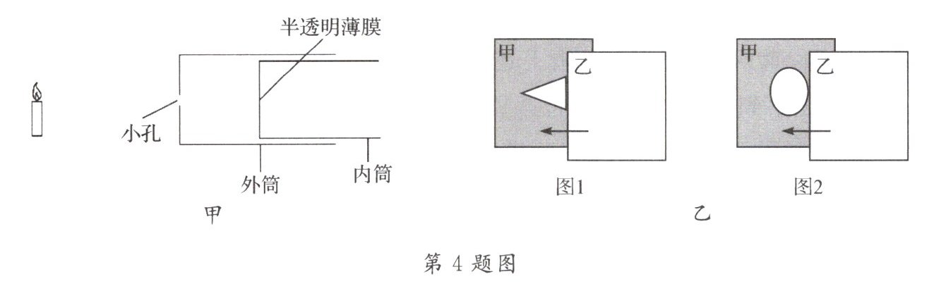 4. 学习了光的直线传播知识后,小科利用生活中的废旧物品探究小孔成像规律,他用不透明纸盒和半透明薄膜做了一个“针孔照相机”(如图甲所示)。