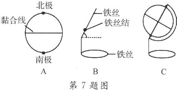 7. 如图为课外兴趣小组同学利用乒乓球、细铁丝制作地球仪的过程示意图。黏合线代表赤道,先利用铁丝做成图 B 所示支架,再固定乒乓球,最后用黑色水笔在乒乓球上描出经纬网。在制作好的“乒乓球”地球仪上,用蓝色的水笔画出东、西半球和南、北半球的分界线。同学们,你们也行动起来,比一比谁做的地球仪最棒! 并说说制作过程中需要注意的地方。