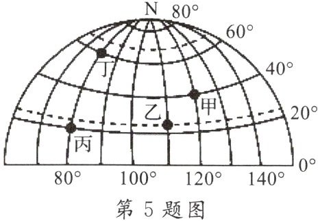 )A.丙地的地理坐标是$(20^{\circ}N,80^{\circ}E)$