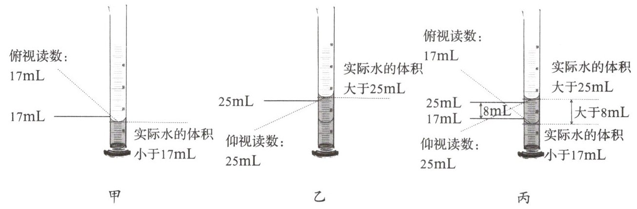 【解析】本题的难点是掌握量筒的读数方法。我们可以根据量筒的使用方法和仰视、俯视产生偏差的具体情况进行解题。用量筒量取液体时,如果仰视液面,读数比实际值略小;若俯视液面,读数比实际值略大。小明同学用量筒量取液体,开始时俯视读数(如图甲),读数为 $17mL$,则读数比实际值略大,实际值小于 $17mL$;加入一定量的水后,仰视读数(如图乙),读数为 $25mL$,则比实际值略小,实际值大于 $25mL$;所以,小明实际倒入的水的体积大于 $8mL$(如图丙)。