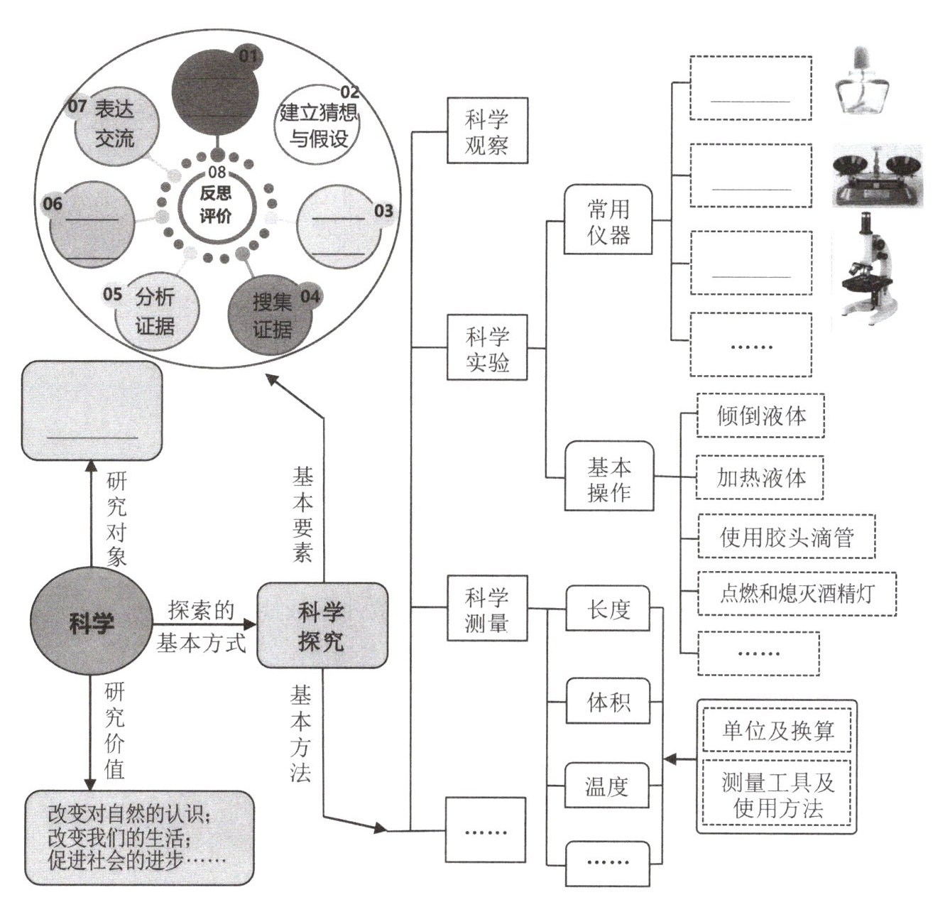 提出问题 制订计划 得出结论 自然界各种现象 酒精灯 托盘天平 显微镜