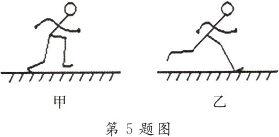5. 在某中学秋季田径运动会上,李好同学奋力拼搏,勇夺男子100m冠军。如图为该同学奔跑途中的两个瞬间,用$f_{1}$、$f_{2}$分别表示该同学在图甲、乙两瞬间所受到的摩擦力,则关于$f_{1}$、$f_{2}$的方向,以下说法正确的是 (
