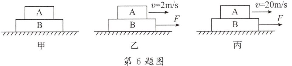 6. A、B两物体叠放在水平桌面上,在如图所示的三种情况下:①甲图中两物体均处于静止状态;②乙图中水平恒力F作用在B物体上,使A、B一起以2m/s的速度做匀速直线运动;③丙图中水平恒力F作用在B物体上,使A、B一起以20m/s的速度做匀速直线运动。比较上述三种情况下物体A、B在水平方向的受力情况,以下说法正确的是 (