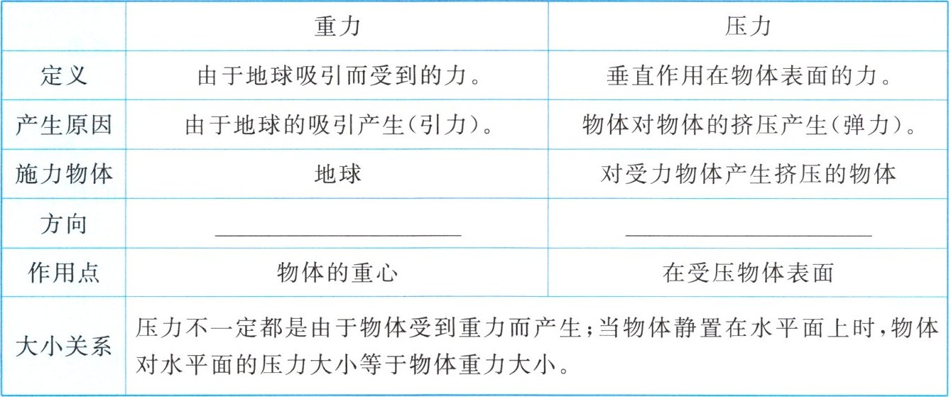 | 施力物体 | 地球 | 对受力物体产生挤压的物体 |