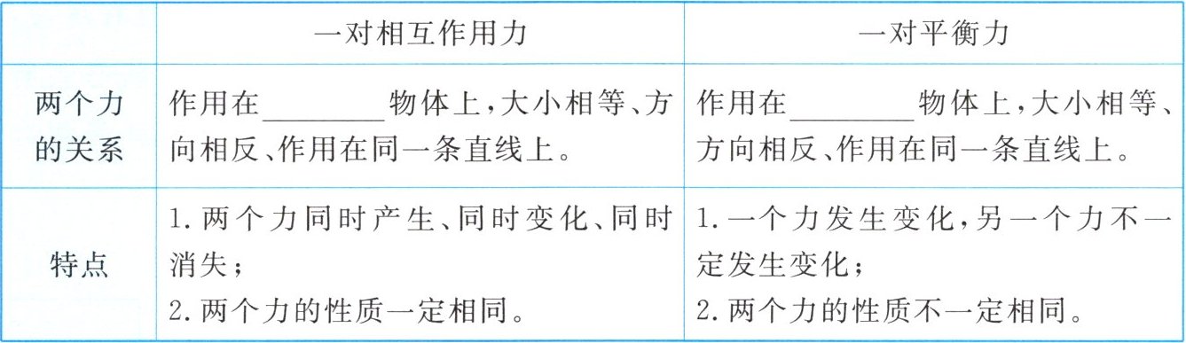 物体上,大小相等、方向相反、作用在同一条直线上。 || 特点 | 1. 两个力同时产生、同时变化、同时消失;2. 两个力的性质一定相同。 | 1. 一个力发生变化,另一个力不一定发生变化;2. 两个力的性质不一定相同。 |