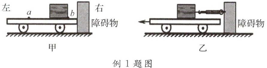 例 1. 木块与小车一起向右做匀速直线运动,遇到一障碍物时,小车停下,木块从车上的 a 点滑至 b 点(如图甲),这是因为木块具有