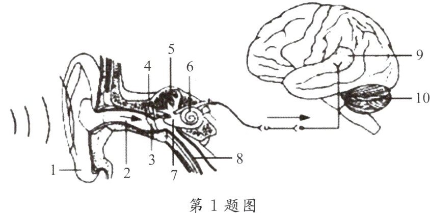 )①声波;②听神经;③耳蜗内的听觉感受器;④鼓膜;⑤听小骨;⑥大脑