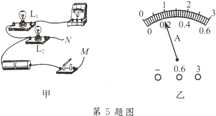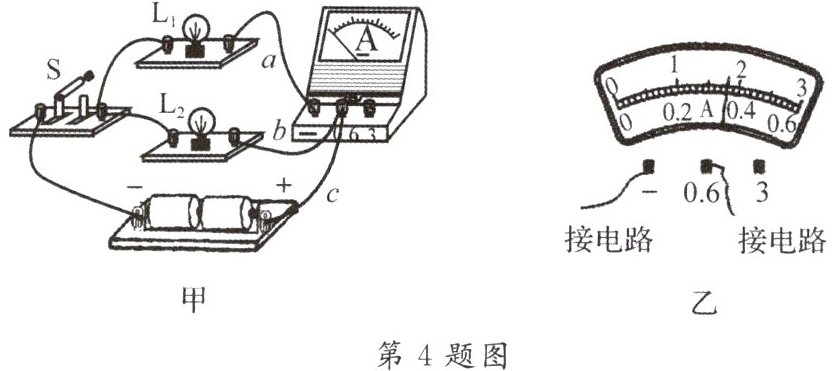 4. 如图甲所示的电路,当开关$S$闭合后,电流表测量的是通过______(填“电源”“$L_{1}$”或“$L_{2}$”)的电流;电流表的指针偏转如图乙所示,则电流表的示数为______$A$。如果要用电流表测干路电流,且只允许移动其中一根导线,应将导线______(填“$a$”“$b$”或“$c$”)的右端接在电流表的______(填“正”或“负”)接线柱上。