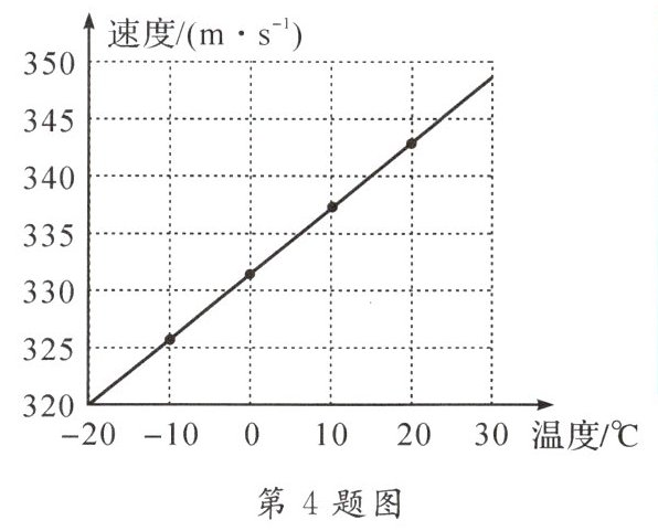 4. 如图是声音在干燥空气中传播的速度随温度变化的图像,下表为在25℃时声音在不同介质中的速度。