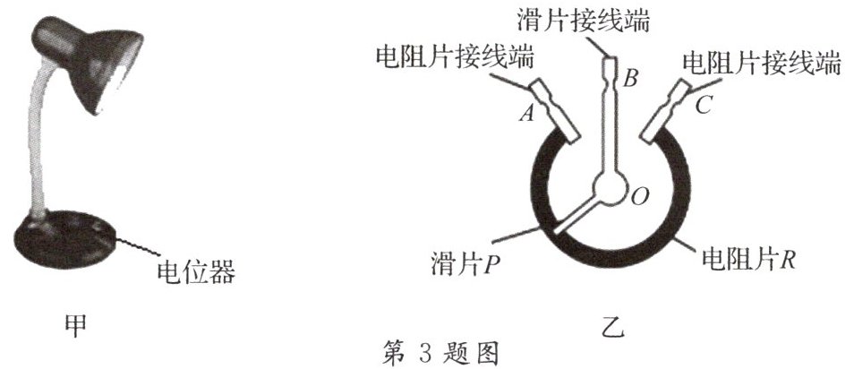 3. 生活中很多电器需要调节电阻大小来使用,如图甲为亮度可调的台灯,电位器是调节其亮度的装置,乙图为电位器的内部结构示意图,$ A $、$ B $、$ C $ 是它的三个接线柱,旋钮带动滑片转动。若将其与灯泡串联,要使滑片 $ P $ 顺时针转动时,灯泡变暗,下列接法正确的是(