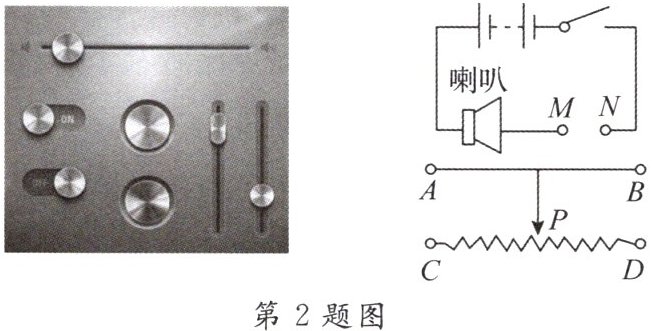 2. 如图是音响上音量调节装置及简化电路,现需在 $ M $、$ N $ 间接入一个滑动变阻器,使滑片 $ P $ 向右移动时电流减小,音量降低。下列连接方式中可行的是(