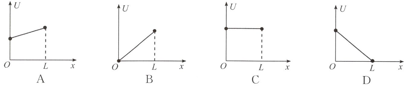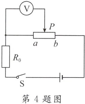 4. 已知导体的电阻跟导体的长度成正比。在如图所示的电路中,粗细均匀的电阻丝 $ ab $ 长为 $ L $,滑片 $ P $ 与 $ ab $ 接触良好,并可自由滑动,$ R_0 $ 为定值电阻,电源电压不变。若以 $ P $ 离 $ a $ 点的距离 $ x $ 为横坐标,电压表示数 $ U $ 为纵坐标,闭合开关 $ S $,$ U $ 随 $ x $ 变化的图线为(