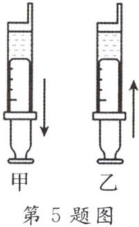 5. 小红对“气体在液体中溶解能力强弱与气压的关系”进行了研究,并设计了如图所示的实验:用20毫升注射器吸取10毫升某碳酸饮料(饮料中溶解有二氧化碳气体),并用胶头封闭注射器针孔。在图甲中,小红用力向外拉动注射器活塞,管中出现许多小气泡;图乙中,用力向里推注射器活塞,小气泡减少。