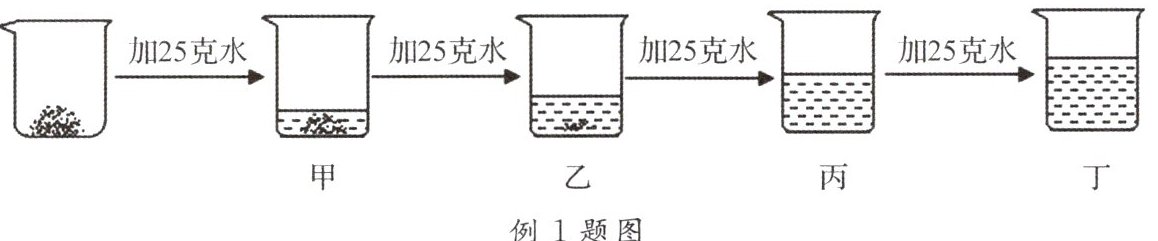 例 1. 在 $20^{\circ}C$ 时,取一定质量的固体硝酸钾于烧杯中,把 $100g$ 水平均分成四份依次加入烧杯,不断搅拌,使之充分溶解,实验过程如图所示。下列分析正确的是